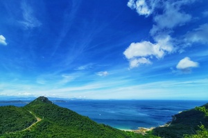 山顶两侧是大海、远处飘浮的小岛、天空的白云