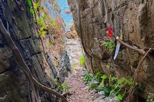 13:00 沿海岸线攀越山崖、踏过礁石,团友们之间尽可能互相帮忙度过攀登的难点。