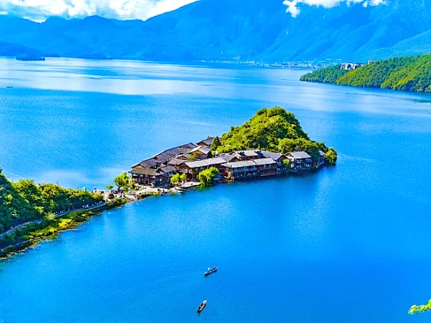 早餐后我们在码头【乘猪槽船】前往【里务比岛】,观赏泸沽湖美丽的岛屿风光,船儿划向湖中的小岛,一弯碧水,白云、蓝天、青山都清清晰晰地装在湖里,上下天光浑然一色,湖面金光闪闪,邂逅如仙境般的湖光山色!
