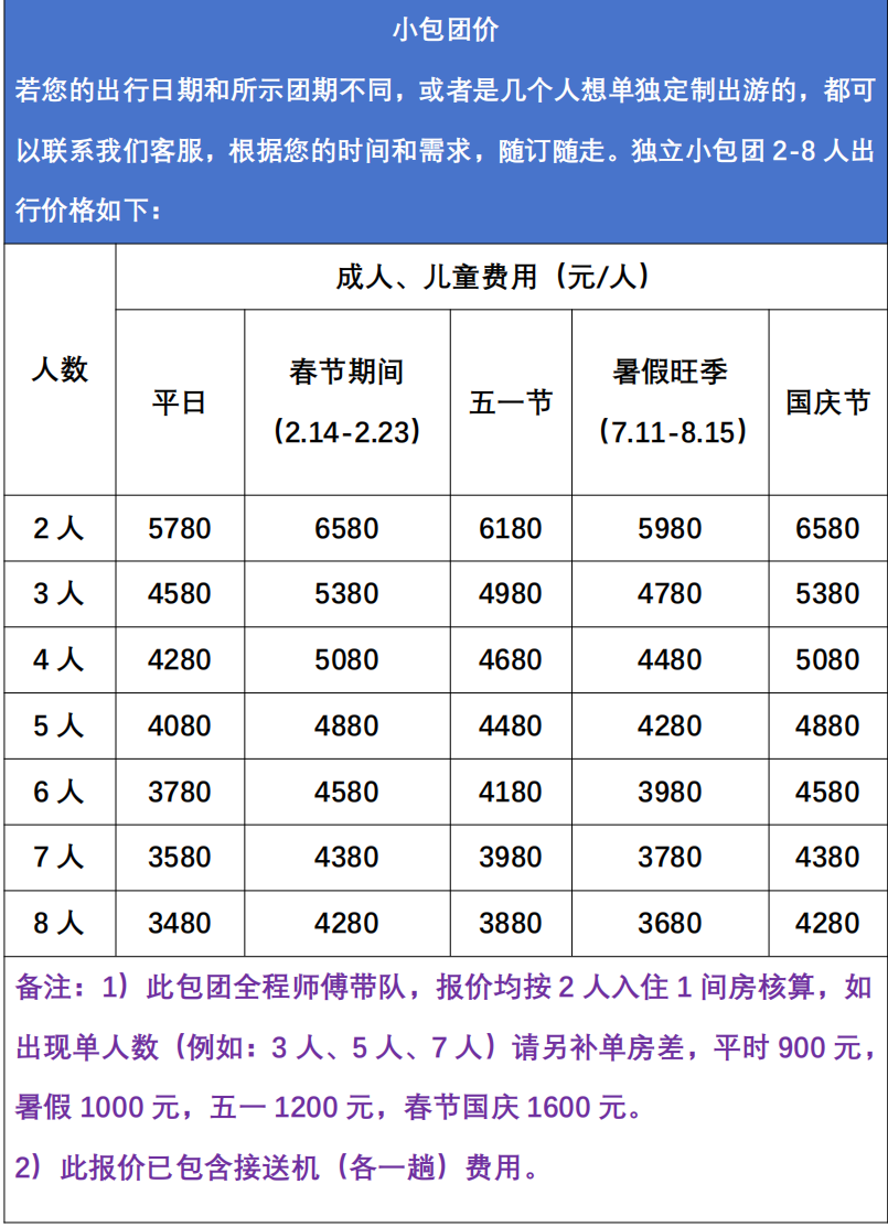 3、单房差:行程住宿按照双人标间安排,如遇到单人报名,我们会尽量安排拼房,如无法拼房则需补单人房差:平常900元,暑假1000元, 五一1200元, 春节/国庆1600元;