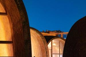 【御窑博物馆】建筑风格独特,借鉴了景德镇清代独创的蛋形柴窑构造特点,八个长度不一、大小各异的多曲面钢筋混凝士拱体结构,拱体内外侧采用悬挂窑砖装饰,拱体两端采用木框玻璃幕墙封闭,并通过下沉广场、景观水池、民窑遗迹、景观绿化、清水混凝士墙顶、青色花岗岩地面等结构,将建筑、景观、遗址融为一体。整体建筑层次丰富真正回归到“自然建筑”之本质。多个砖砌半圆拱形建筑交相辉印形成“横看成岭侧看成峰”之美景,颇有山水画意境。