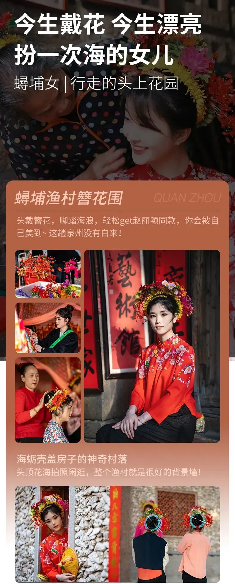 08:40 游览蟳埔,蟳埔村有两大特色文化,蚵壳厝建筑和头戴簪花的蟳埔女。小姐姐们有兴趣的还可体验蟳埔女的造型拍照纪念(费用自愿自理哟,如需要旅拍的可以提前在网上预约哈,报名时咨询客服)
