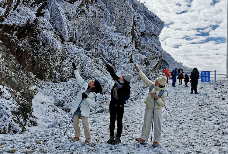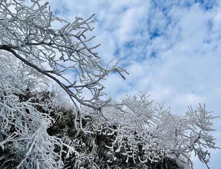 云冰山的冬天,有着南方罕见而迷人的冰雪景观,草木披上一层冰霜,伊然一派北国的风光。