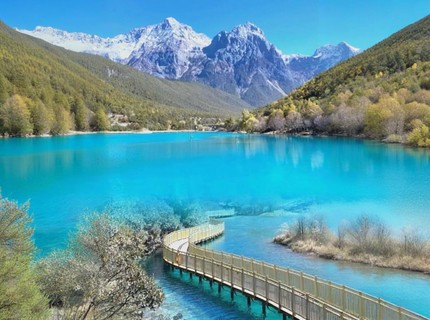 午餐之后前往 “仙人遗田”之称的小九寨沟【蓝月谷】(不含蓝月谷电瓶车费用,可自由选择),其前身为人们所熟知的 “白水河”,蓝月谷又名白水河,在晴天时,水的颜色是蓝色的,而且山谷呈月牙形,远看就象一轮蓝色的月亮镶嵌在玉龙雪山脚下,所以名叫蓝月谷,