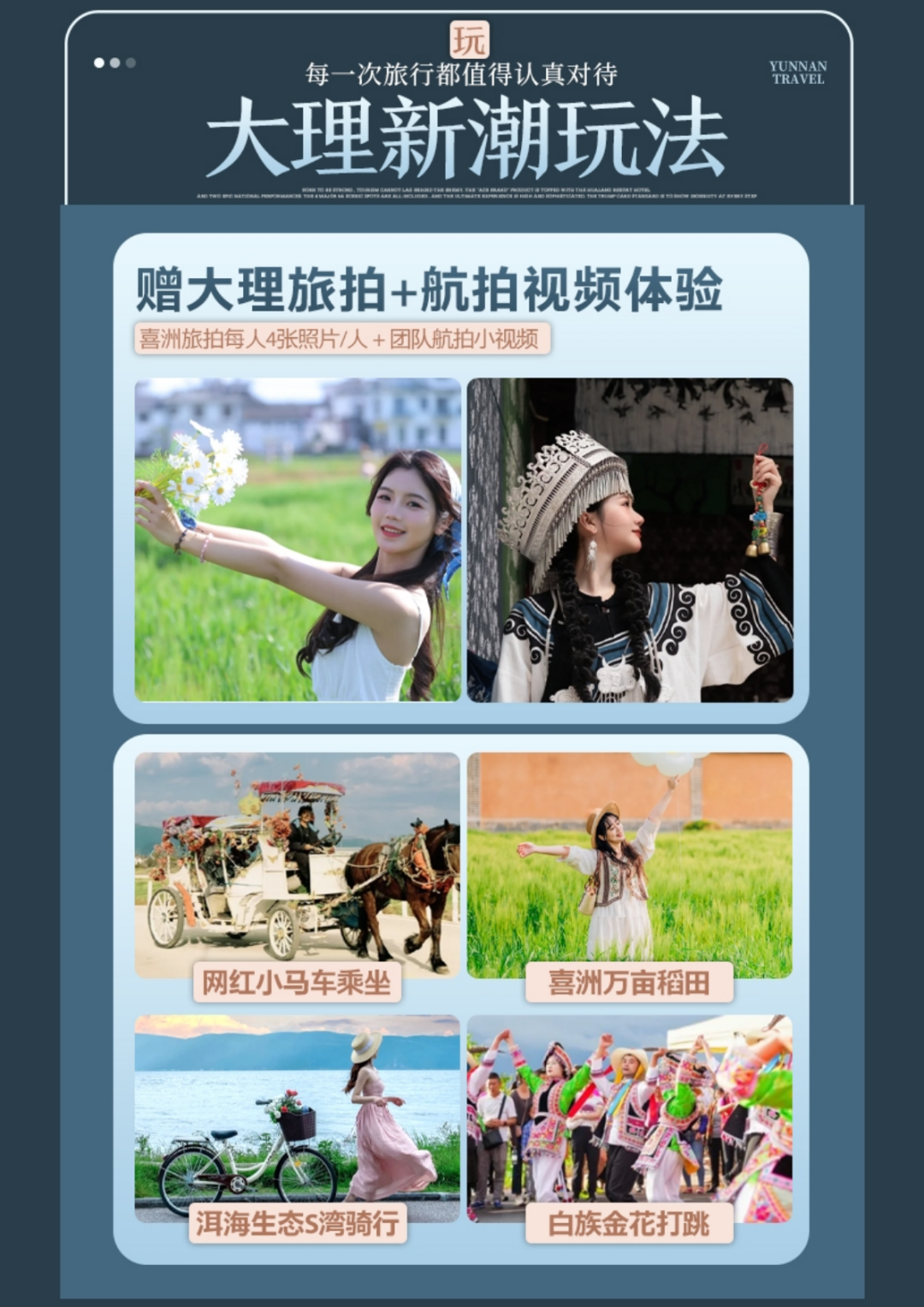 ▶ 祥云→洱海公园→喜洲独家网红小马车→千亩稻田→洱海生态廊道S湾骑行→金花领舞打跳→旅拍航拍→大理理想邦→大理酒店