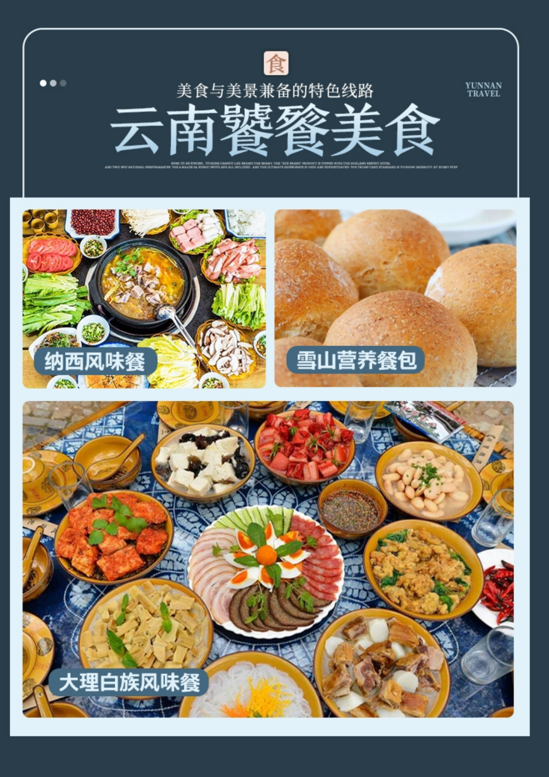 3、 云南少数民族众多,当地民族饮食独成特色,口味偏重,偏辣和偏酸,素菜讲究原生态的做法,很多蔬菜的做法仅用清水煮后,蘸酱而食,乃当地饮食一大特色。另外当地独特的马帮菜、纳西美食、过桥米线、野生菌火锅,白族美食等,值得大家品尝;当地水土为弱酸性,建议多饮茶水,以中和酸碱。