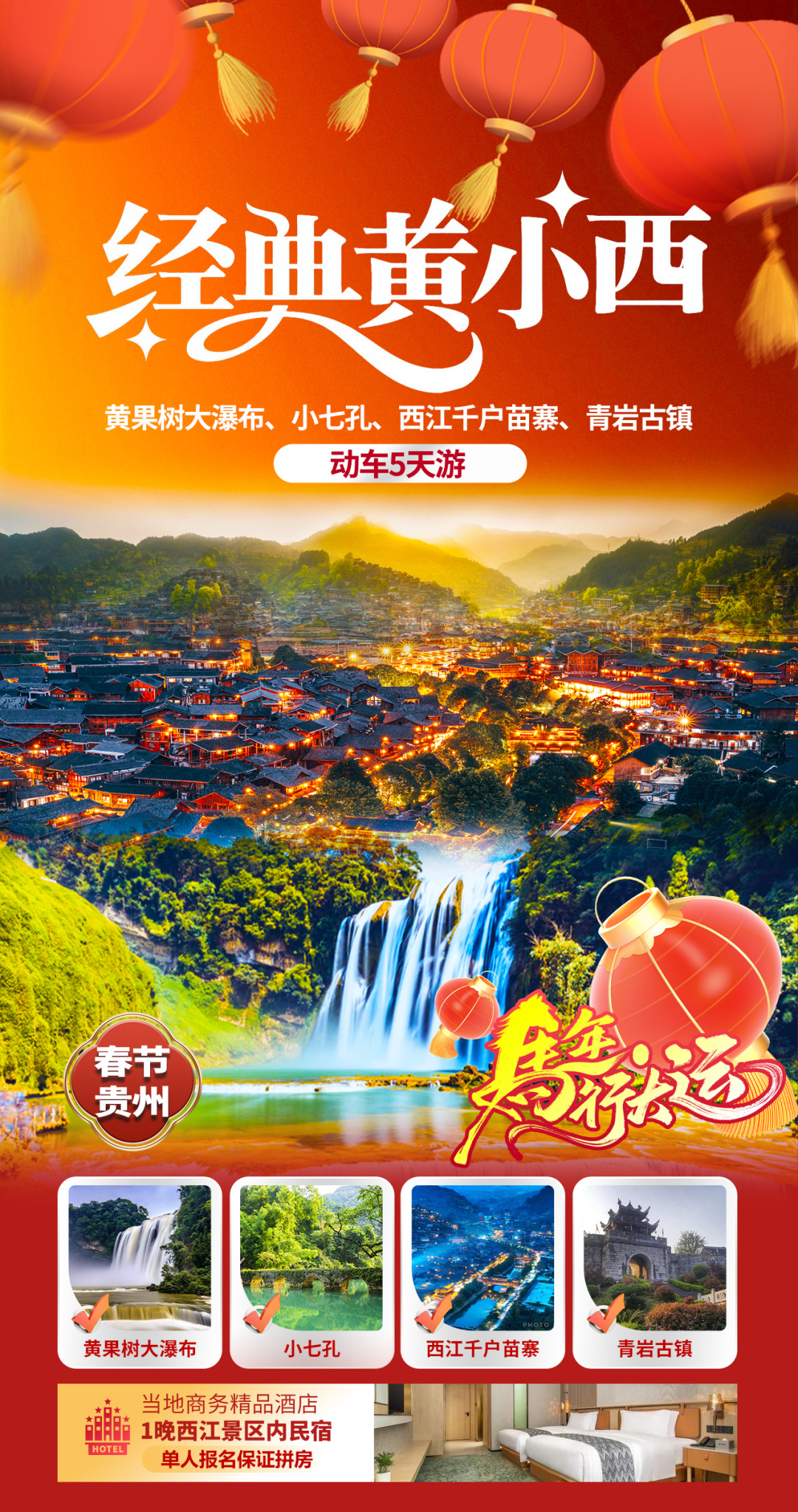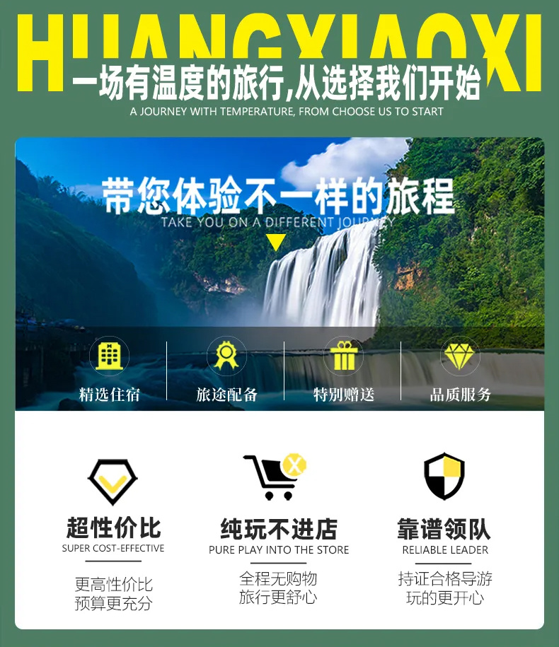 2. 不含景区必消小交通:黄果树大瀑布观光车50元/人+保险10元/人、小七孔观光车40元/人+保险10元/人、西江4程观光车20元/人+保险10元/人,青岩观光车25元/人,费用需自理。总合计165元