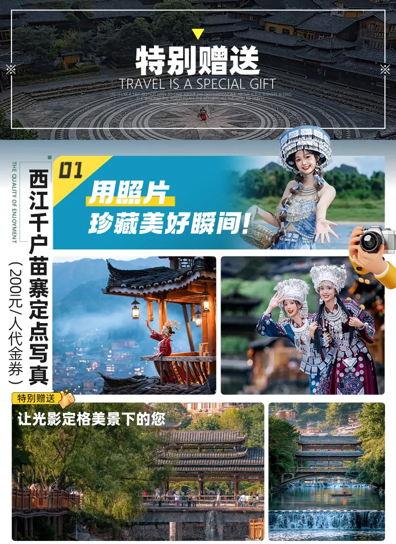 5. 赠送200元/人西江定点旅拍代金券(可在西江指定旅拍点使用,不可折现,单张代金券只能使用一次)。