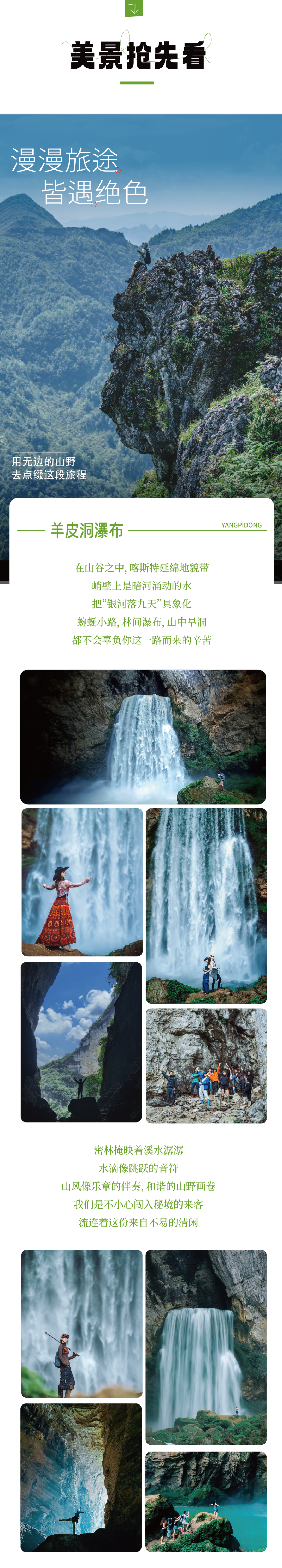 早餐后乘车前往徒步起点。热身后,我们将沿着湿滑陡峭的原始小径下探峡谷,当轰鸣水声渐近,磅礴的羊皮洞瀑布豁然眼前。您可在水雾弥漫中尽情创作大片。中午在开阔处分享自带路餐。下午可随领队探索瀑布旁的洞穴,随后徒步环线返回,乘车回贵阳。