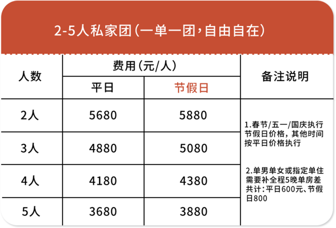 ➂ 单房差:单人报名默认同性拼房(拼房不成功无需另付单房差);指定单住或1成人带1儿童(需补全程5晚单房差价共计:平日600元/春节.五一.暑假.国庆800元)2人一起报名默认住1间房(如需分开住请主动说明)