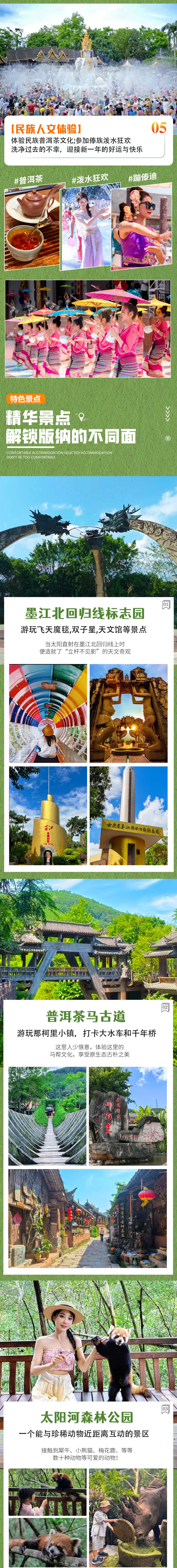 【特别体验】:1)户外体验:特别安排体验热带雨林轻徒步+尊享户外雨林大餐,零距离感受热带雨林的独特魅力;2)世界遗产:深入世界非物质文化遗产腹地-景迈山,了解和体验不同人文和风景;3)民族人文体验:体验民族普洱茶文化和傣族同胞泼水狂欢;
