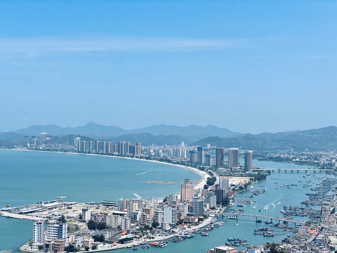 站在观景台,可以看见双月湾全景,左右两个半月,一个是风平浪静,一个是波涛汹涌,挺奇特的风景,远处青山连绵,近处是宽阔的海湾,风景尽收眼底。