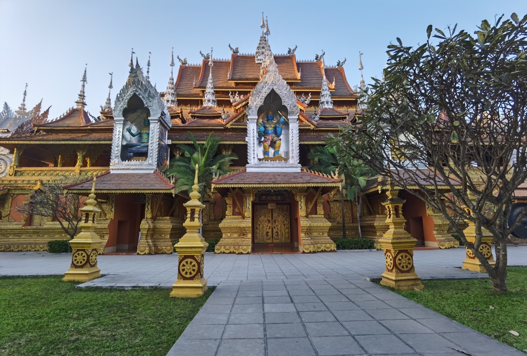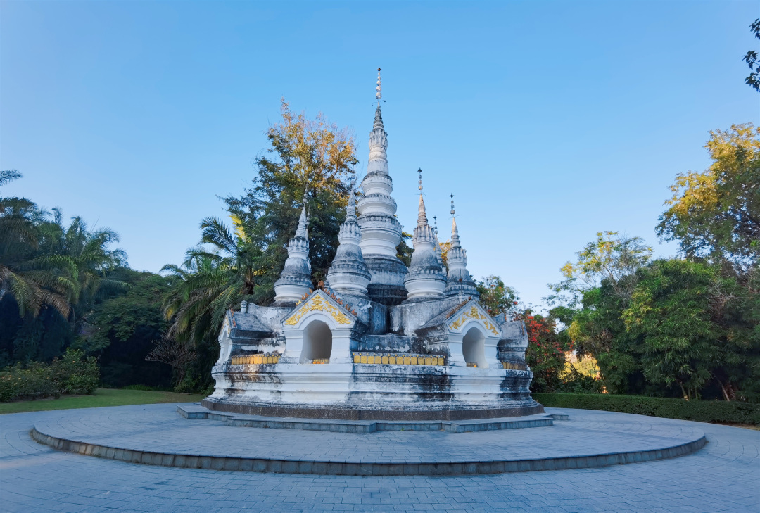 雄伟的景洪大金塔,塔身高66.6米,寓意一江连六国(中国、老挝、缅甸、泰国、柬埔寨和越南),在夜晚更加的辉煌耀眼,不禁让人流连忘返,仿佛置身在泰国。