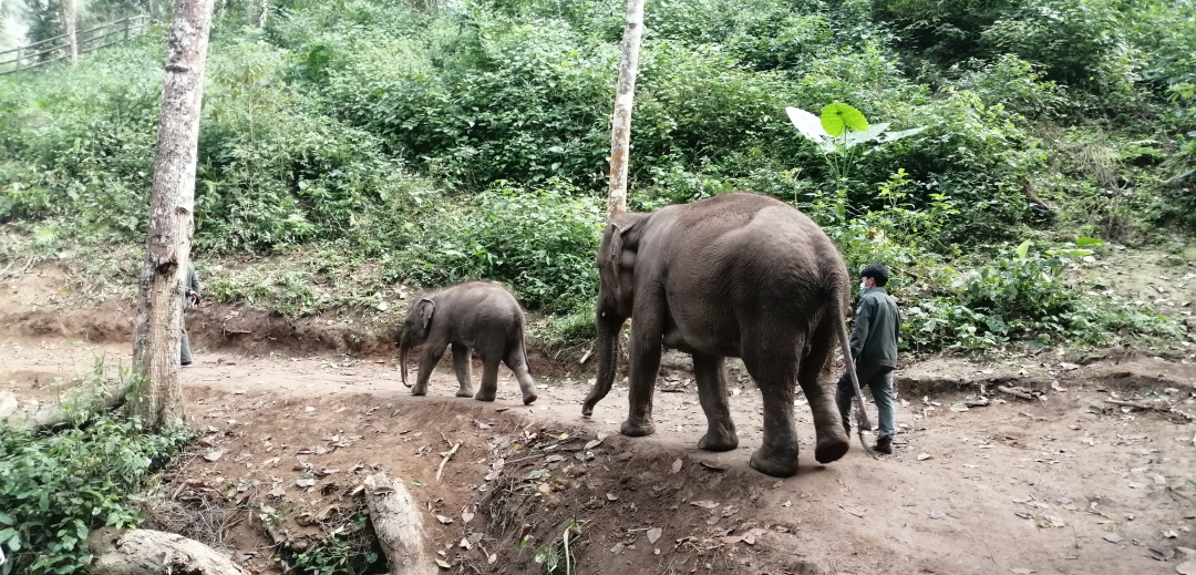 雨林牧象是野象谷内一项,跟随着工作人员来到一片静谧的森林里,和一大一小的两只象在森林里散步。既能参与到它们的生活里,又不会打扰到它们。