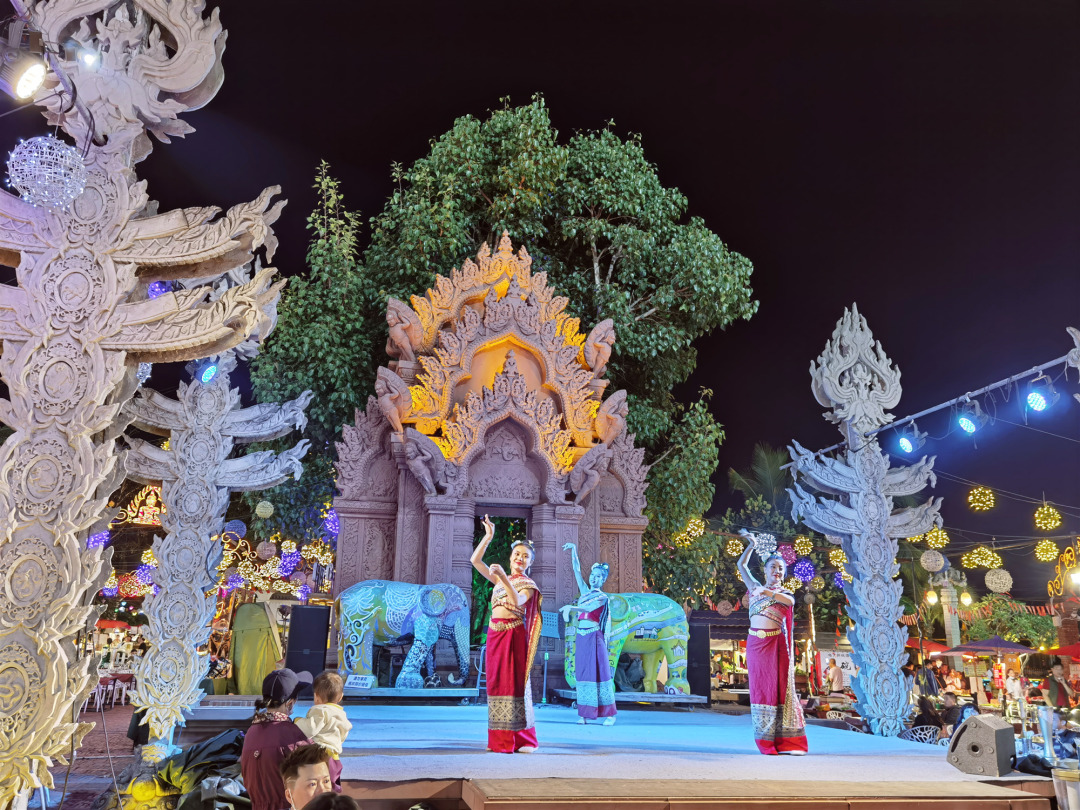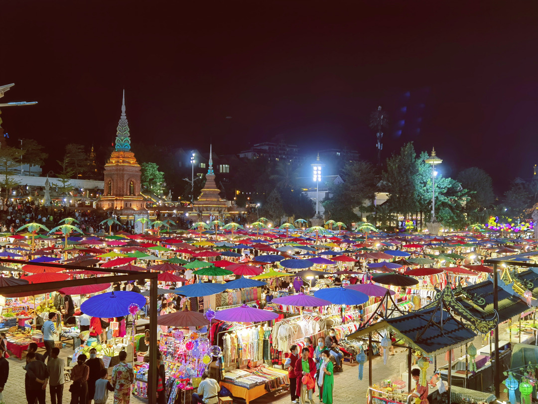 安静的大金塔身后,就是人声鼎沸的星光夜市,它是大金三角最具规模、最具特色的夜市。