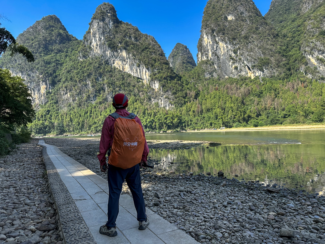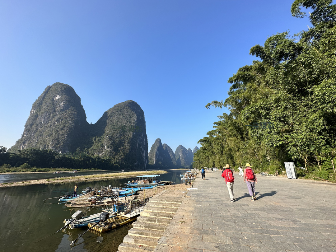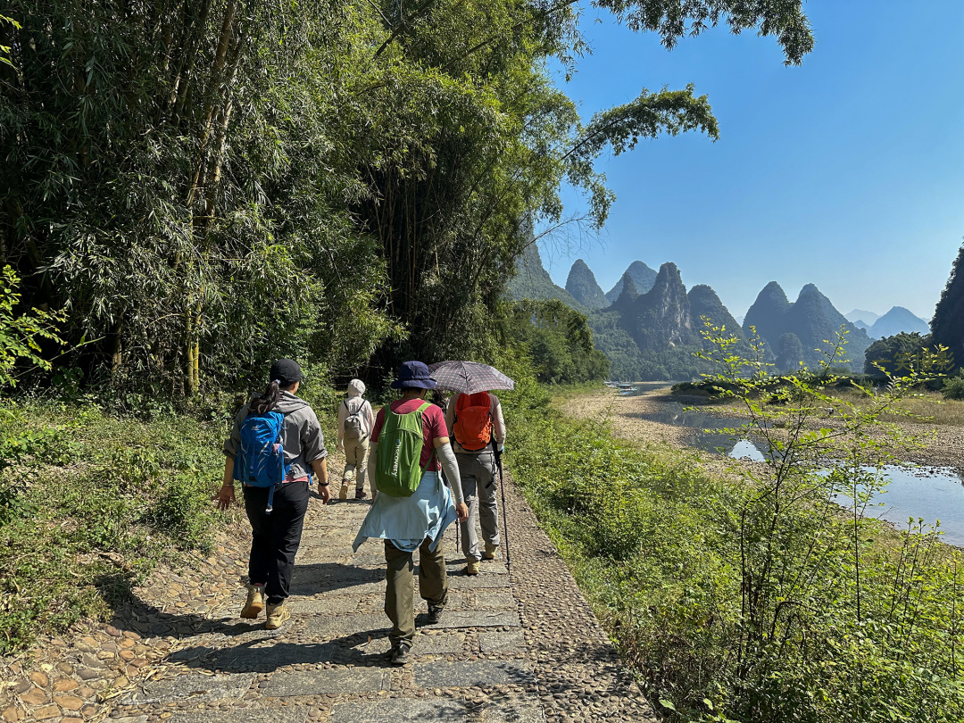沿西岸行进至“下龙”、“甲天下”等漓江畔著名景致,打卡留念,小憩。经“老村头”、“冷水村”至“九马画山”观马后(可以试试能否数出画山中的 9 匹马,看看自己有没有状元的潜质),摆渡过江。沿江畔竹林前行,经“黄布倒影”、“20元人民币背景”……抵达当日终点:兴坪“厄根底”村。