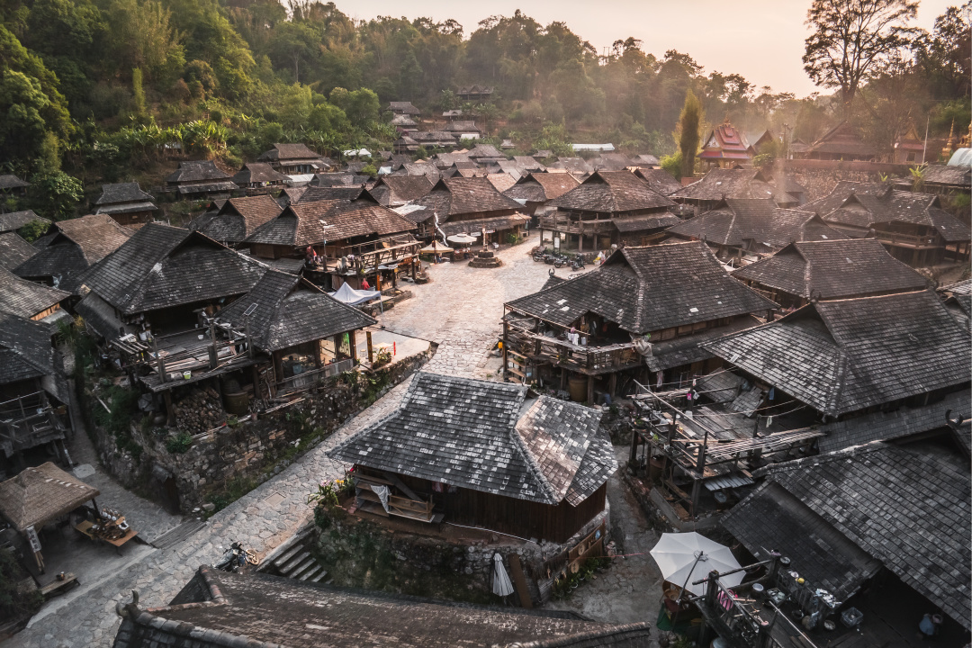 从西双版纳出发,一路向西南而行,穿过起伏的山峦与绵延的热带雨林,便抵达了宁静隐秘的景迈山。首先探访的是深藏于古茶林间的糯干古寨。这里仿佛被时光轻轻搁置,传统干栏式傣家木楼错落有致,四周被千年万亩古茶园温柔环抱。漫步寨中,空气里浸润着茶叶的清香,古朴而安然。