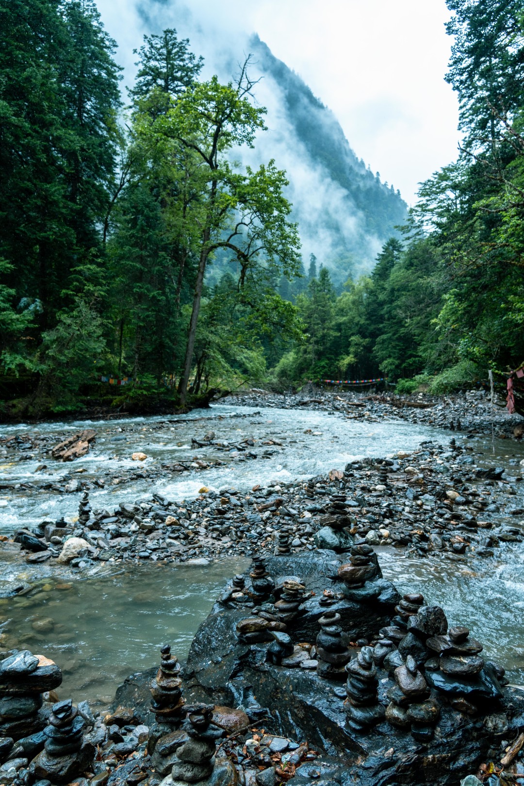 早晨,我们8点左右出发,沿着雨崩河一路下坡去寻找【尼农峡谷】。